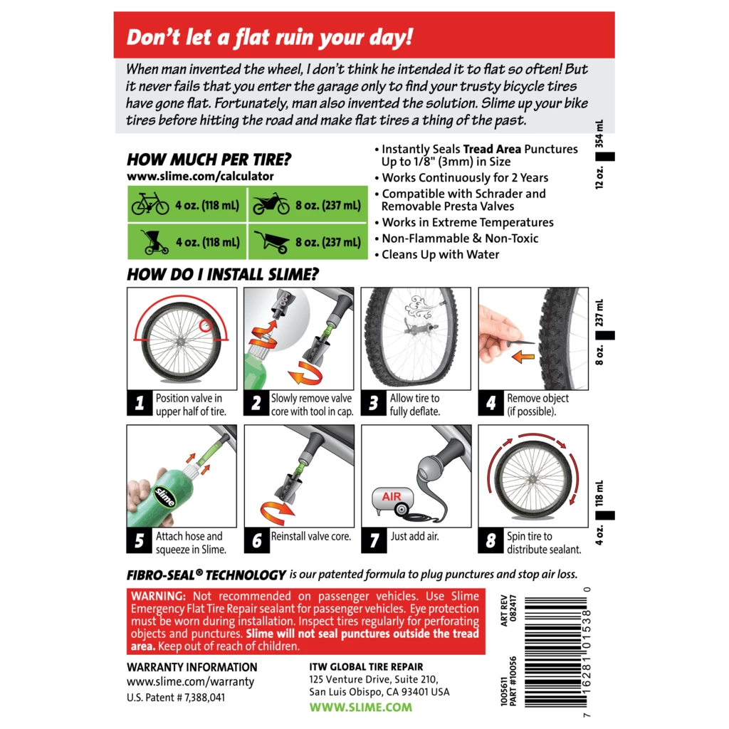When a rupture occurs, the sealant is immediately directed to the puncture and works as a flexible plug to stop air loss from the tube. The Slime Tube Sealant is designed to repeatedly repair punctures up to 3 mm (1/8 inch), and is guaranteed to protect flat tires for up to 2 years!